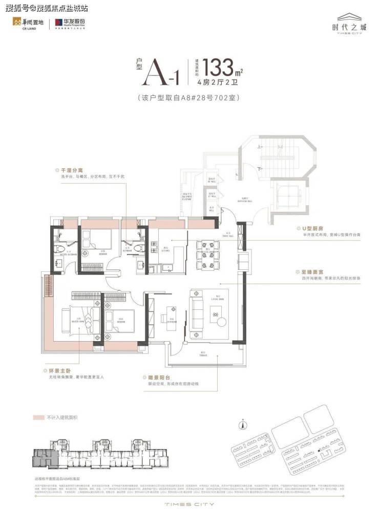 建筑面积约133㎡四房两厅二卫,该户型四开间朝南四房配置,有两点很独特: