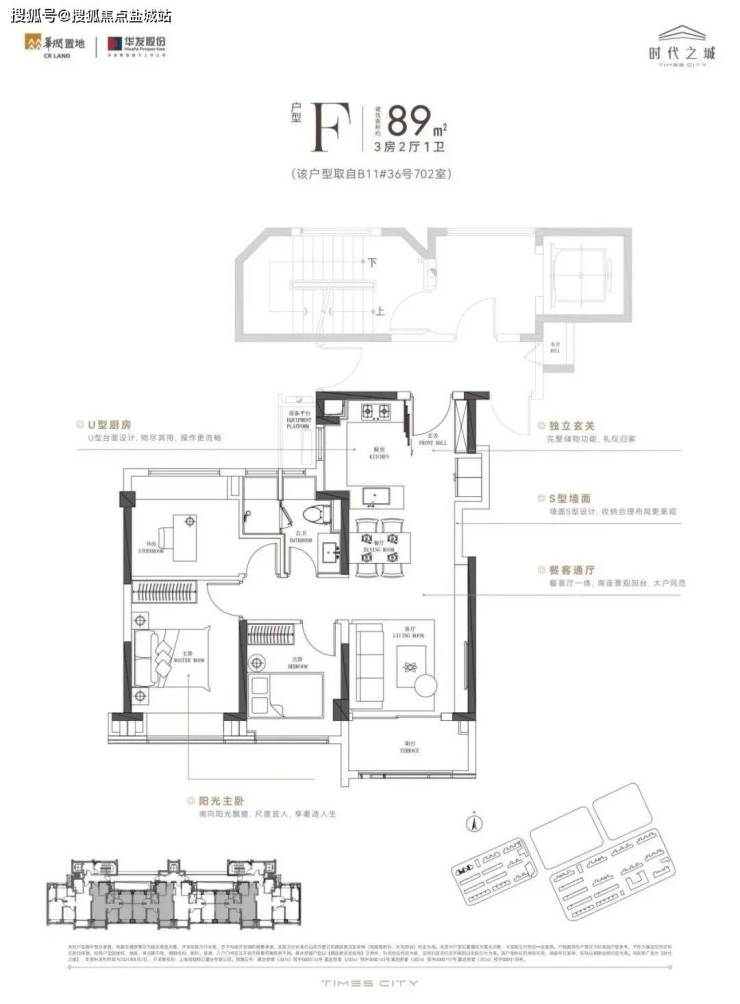 建筑面积约89㎡3室2厅1卫,客餐厅一体,南连景观阳台,诠释时代人物的居住风范。