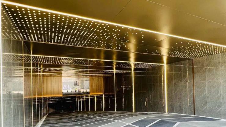 人行主入户大堂,门头采用浅灰大面积铝板,流动曲线勾勒出完美的弧度,在格栅与大面玻璃的点缀下,向整座城市昭示着光影变幻的魅力!
