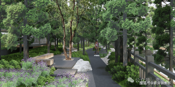 景观上: 因为这得天独厚的天赋,在景观打造上,社区内的景观体系与家门口的水岸滨河景观轴能够相互融合,开发商将自然的水岸植入社区景观营造中,让业主在家门口就能拥有沉浸式的度假风景。