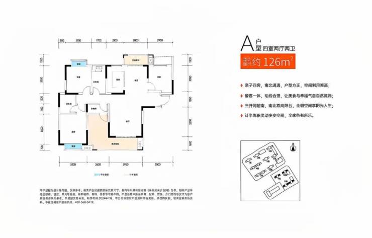 🔘 126㎡户型高配平层(3+1房2厅2卫)南北通透双阳台,客厅(4米开间)/主卧/次卧三开间朝南;南北双阳台、套内花园、双飘窗,可改造面积约12平米,约88%得房率;布局上动静分区,打造成二胎空间,大四房设计,男女主人、父母、小孩享私密空间