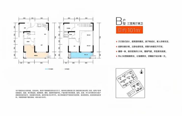 🔘103㎡复式(4房2厅2卫)开福北稀缺复式,唯一在售产品,二手房升值潜力无限;5.9米层高,生活上下层分区;媲美140平米户型,得房率约110%;南向面宽6.5米,3房变4房,3开间朝南;6.5米面宽*2的双景观阳台,无敌采光,景观舒适度加倍;