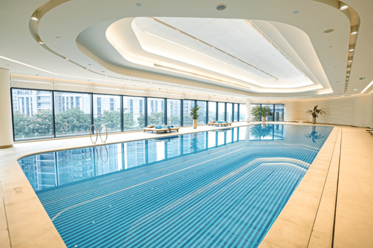四季恒温恒湿的冲浪按摩泳池,约3m宽,约8.45m长,水深约1.2m,跟孩子们游泳嬉戏,没有哪个孩子对玩水有抵抗力。也很好打理,一键伸缩的盖板卷帘,避免了落叶蚊虫,也防止小孩和物品掉落,还有自动除湿功能、自动循环系统,保证安全清洁。同时,这个泳池也可以用于温泉泡池SPA,按摩的水流涌上来,去四季酒店的按摩池里,也就是同样的享受。