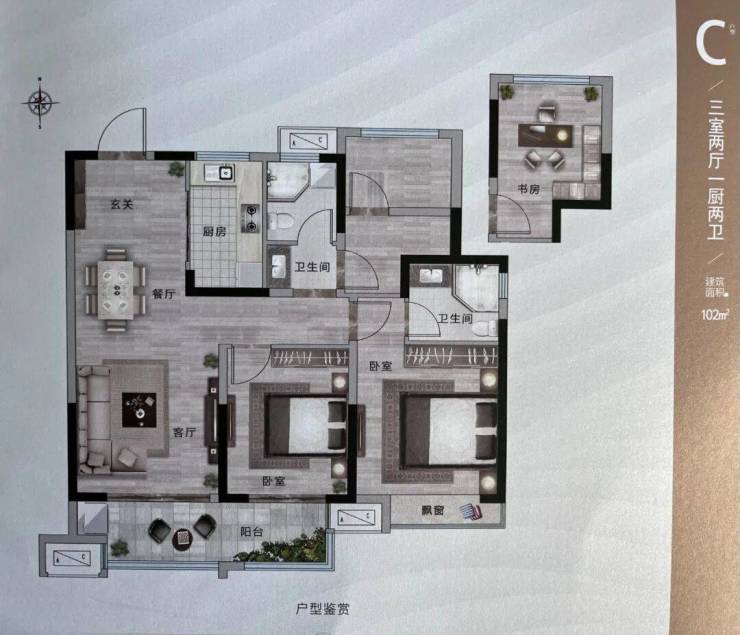 户型建面约82、102㎡,其中建面约82㎡两房一卫,加赠送实际得房率约85%;建面约102㎡三房两卫,加赠送实际得房率约90%。