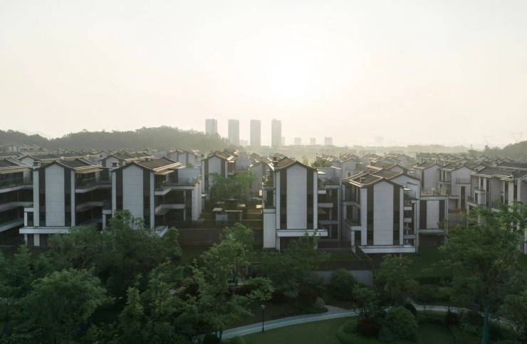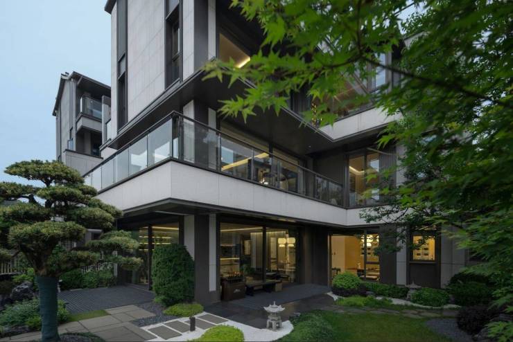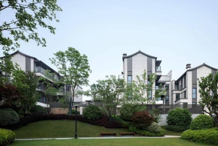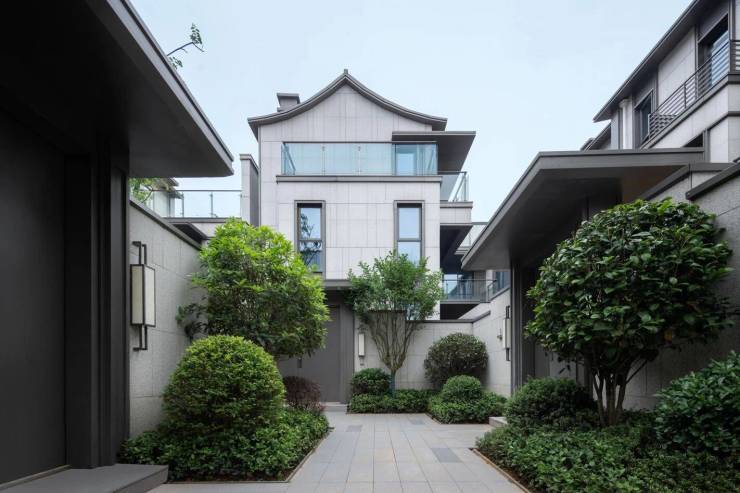 建筑融合宋代美学,立面采用陶瓷保温一体板,人字屋顶搭配乳白色墙身及金属铝板,部分户型拥有双首层南北双庭院入户、全套房设计,地下室可打造为多功能空间。