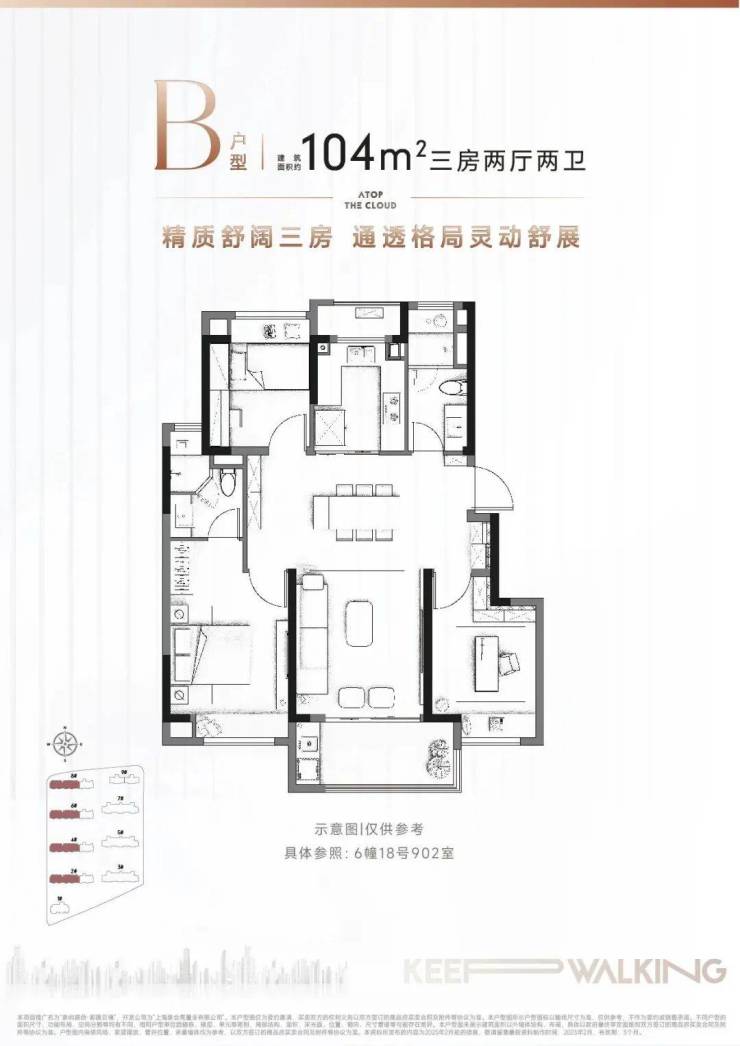 104m²户型:整体做到了真正的南北通透,三房户型的舒适度和阔绰感显露无疑。同面宽、同进深,使餐厅真正的独立存在,放下一张圆桌也绰绰有余。客厅、厨房、餐厅三大功能区以开放的方式连通,将生活的点点滴滴在此尽情演绎。
