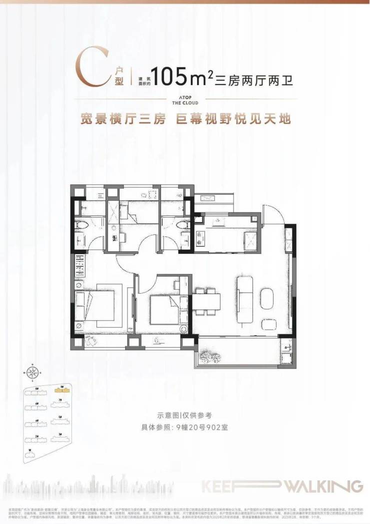 90户型中少见的大面宽阳台, 售楼处电话☎:400-000-0460转6666【预约☎】尺度较约3.3米客厅更多1米,叠加约1.8米进深,营造出大平层级的阔绰享受和宽境视野。