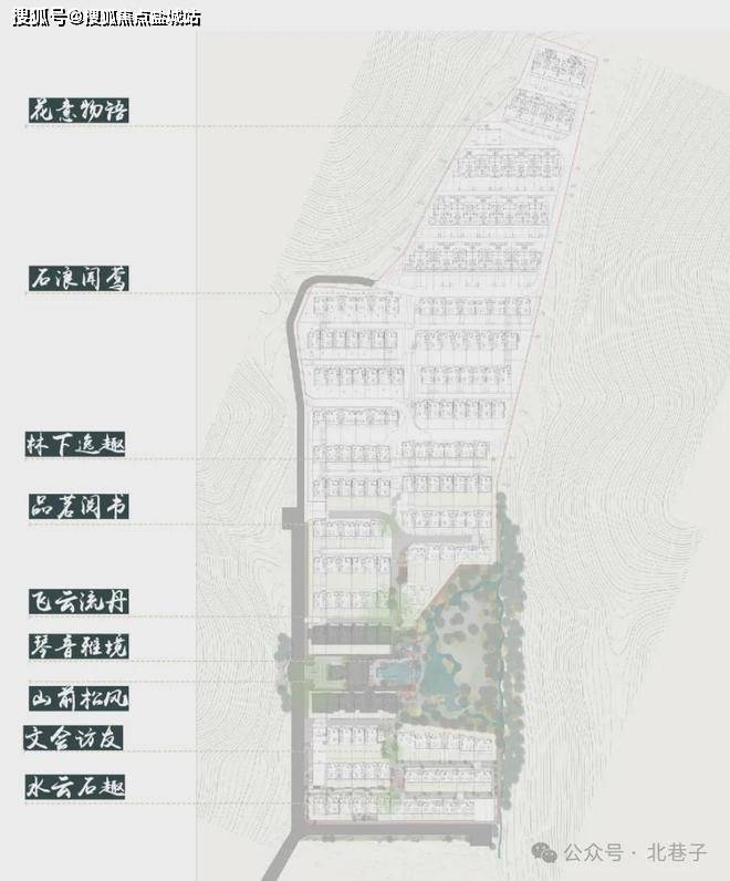 Two axes: Qingyin Road crankshaft, stacked water windward axis connected to immersive homecoming alley, shaping a hidden luxury homecoming ritual sequence;