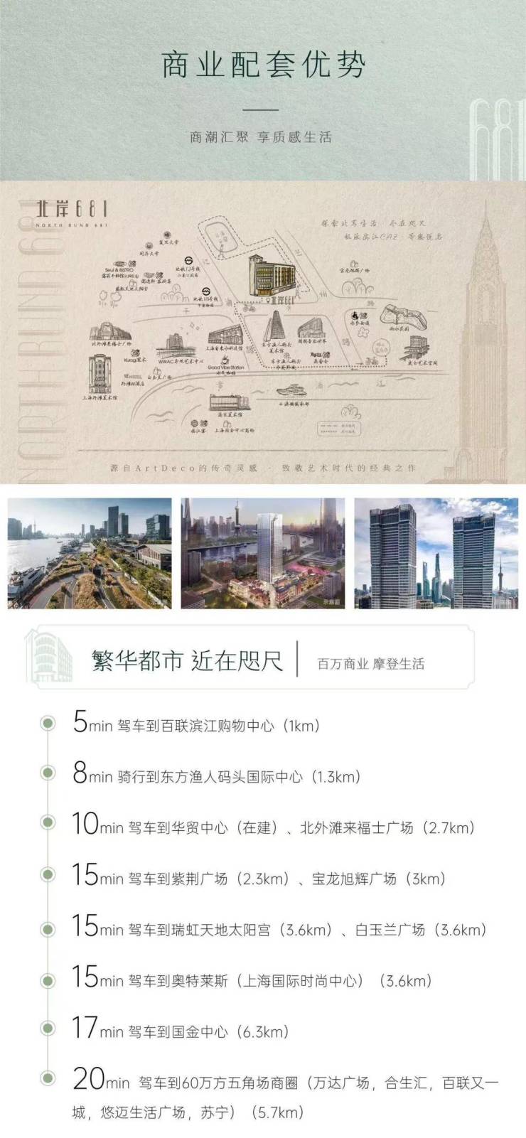 1Omin 驾车到华贸中心(在建)、北外滩来福士广场(2.7km)
