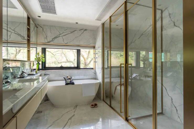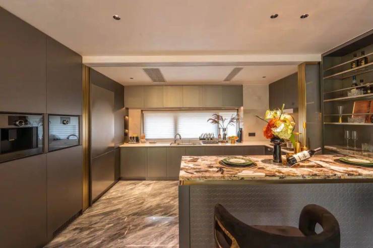 更令人惊艳的是全屋奢石铺装,从鱼肚白、铂金钻,到潘多拉、佛罗伦萨灰...每一块石材都经过精挑细选,天然纹理与金属铝板立面相映成趣,在“量”的克制中实现“质”的极致,远超市面产品的精装规格。