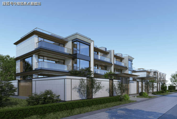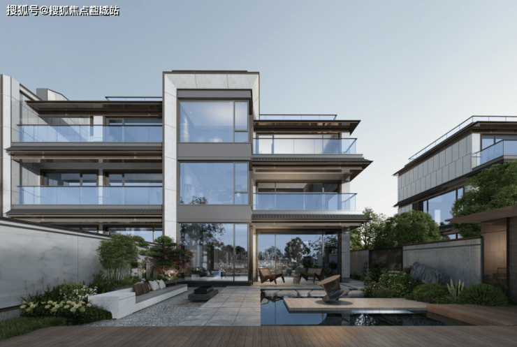 合院方面,大面落地玻璃、灰色铝板、香槟金铝板、白麻石材,不同材质交叠。局部斜切向的边框,立面的点睛之笔,坡面屋檐采用小青瓦,汲取温州传统民居的特色,既有现代时尚感又保留了东方风骨。