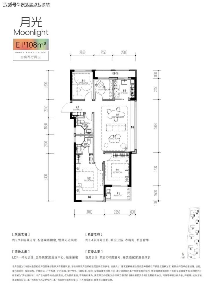 还有建面约108方东边套户型,做到了同级少有的4房2卫巨幕客厅设计。