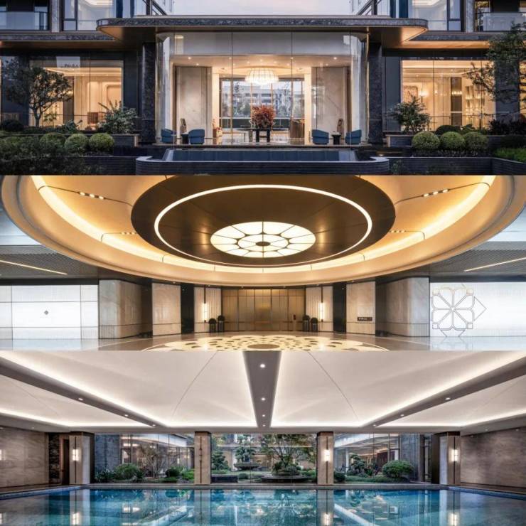 2.臻选景泰蓝(水吧台),东方白(大堂吧等),山水画(恒温泳池)等,以奢石营造“金玉满堂”质感