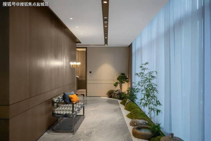 室内还有更精妙之处。潮上中南银座的每套房源,都设计了一条7米多长、3米宽的室内艺术廊道。加藤精心挑选棕竹、铁线蕨,规置手水钵、石灯笼和苔山。