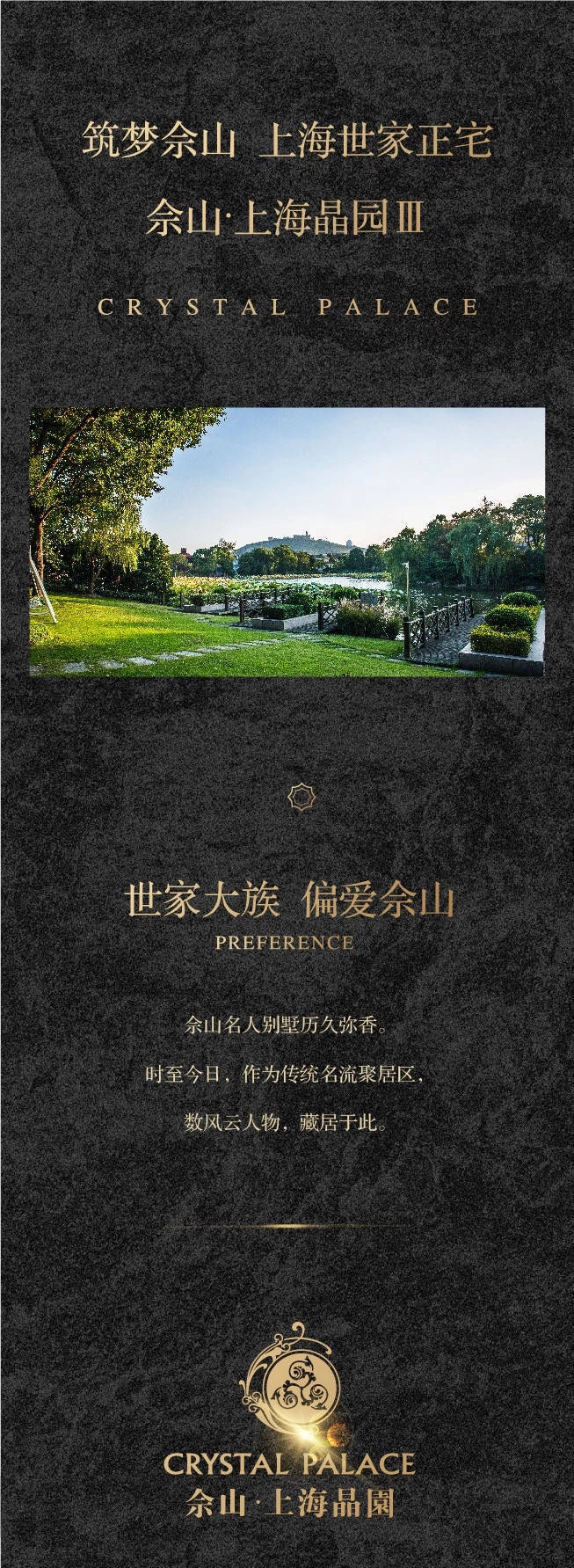佘山•上海晶园位于佘山北麓,依佘山伴月湖。晶园总占地1300亩,容积率0.2,共规划260余幢风格各异、融合世界建筑精华和现代创意思维的经典别墅。