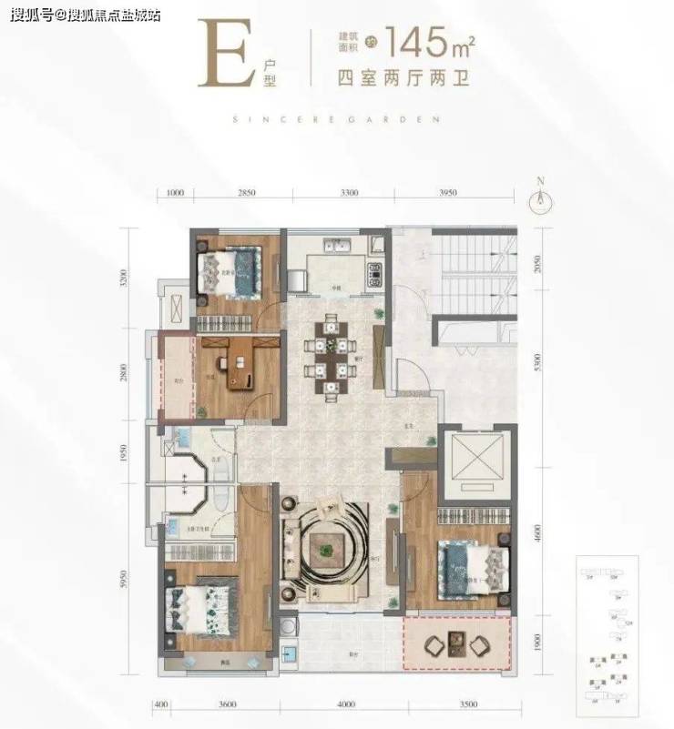 诚园2T2/2T3户,起步95-98平三房只占16%左右,119以上户型占比84%,其中119/126/136/三房占比66%,145四房占比18%,整体定位偏改善。主力户型为126-141大三房,三开间朝南。