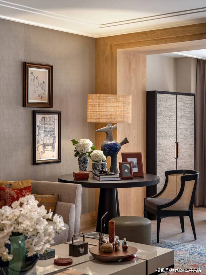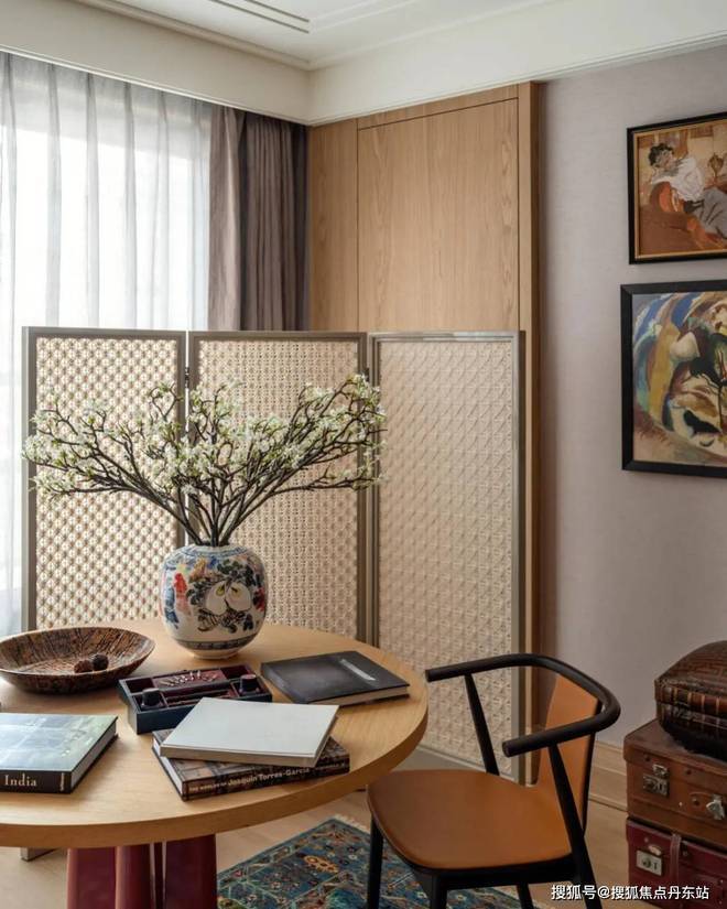 多功能书架彰显着设计的巧思,形成有如博物馆般的展示方式,既可放置日常读物,亦可展示珍本藏书。同时,利用屏风做隔断,与圆桌结合形成私密空间。
