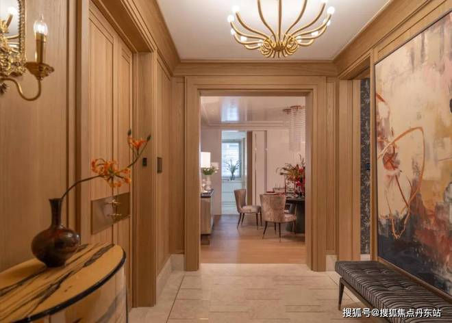 硬装上以木饰面和米色石材做结合,物料原始肌理感,表达经历时间后的沧桑痕迹。大理石地面镶嵌精致金属条,保留材质的原始感,木饰面配柔和灯光,调和出安宁澄澈的归家氛围。