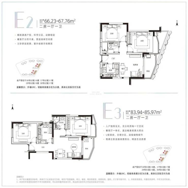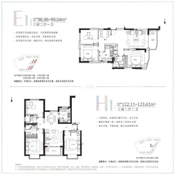 约 109 - 116 平方米为大两房,可满足对空间要求更高的家庭;约 96 - 99 平方米的三房两厅一卫,适合三口之家;