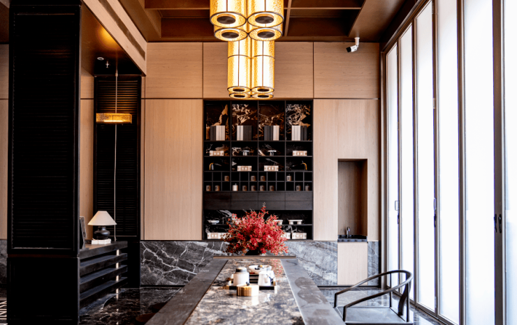 园林设计以苏州拙政园为蓝本,打造“烟雨水院”园林会客厅,融合东方美学与现代生活,提供静谧休闲空间。