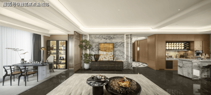 面积超70㎡的转角三连厅+岛台,将客厅、中西餐厅和多功能厅融合。