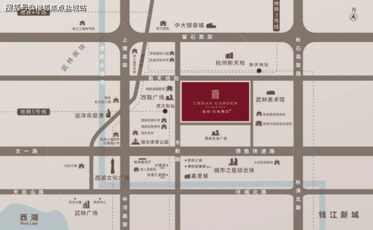 3/4号线交汇的新天地街站约800米、5号线西文街站约300米。周边还有留石、秋石和德胜三条高架动脉,一路畅通杭州“东南西北”。