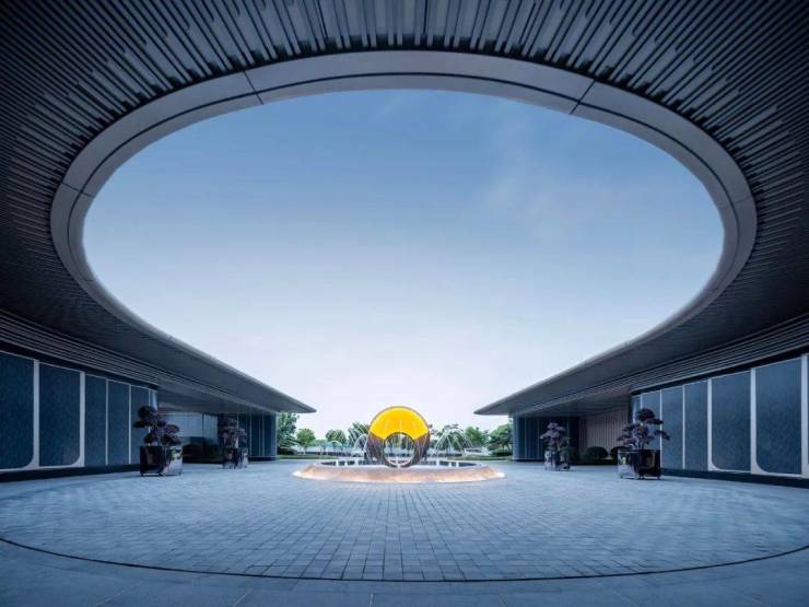 中宁府的建筑立面,采用大面积的定制玻璃+金属铝板,并结合转角、切割、圆弧等复杂工艺。立面的圆弧设计消减了建筑的力量感,令建筑的视觉与周围的景观更为和谐共生,也是项目贯穿始终的重要视觉元素。