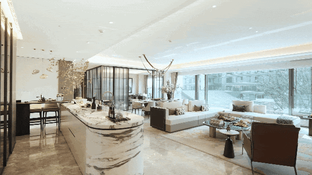320样板房,以“海派东方”为设计之源,在传统文化与海派精神整体交汇的风格中,融入屏风、雕花、水墨等中式元素,传递东方美学的优雅浓缩。在“空中院落”,或琴棋书画,或诗酒花茶,品味人生八雅之乐;转身之间,约21.4米横向IMAX大面宽,让风景与光线的双重盛宴连绵入目。