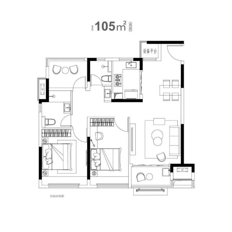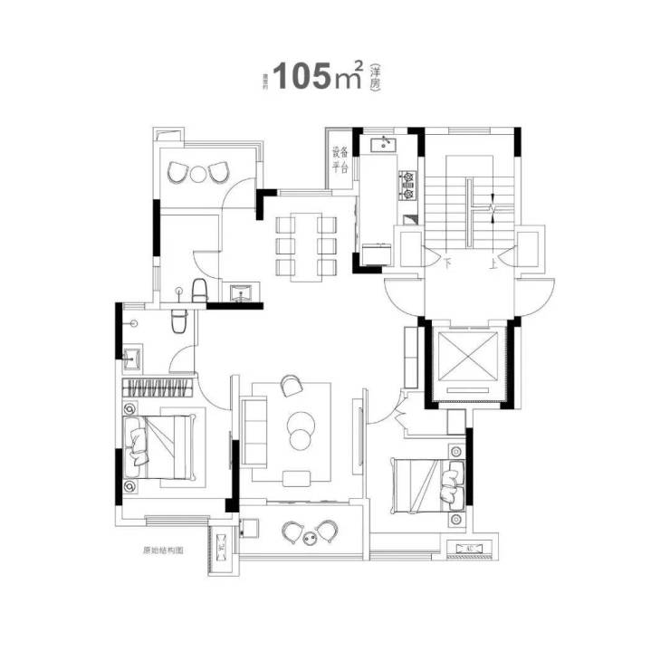 建面约105㎡高层:经典动静分离,客餐厨一体化设计,U型厨房格局,南向三开间采光。