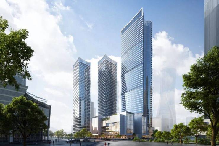 项目最初规划为299米主塔+280米副塔,意图打造“钱塘江北岸第一高楼”。但因航空限高等因素,方案历经5次调整。