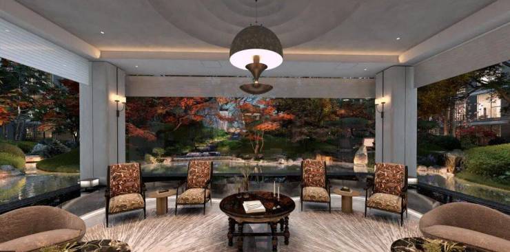 一进鸣之庭,汲取纽约安缦隐奢哲思开启归家尊崇序章;二进山之庭,堆石以筑山势,约3.8米落差叠瀑流泉演绎“高山流水”的诗意画卷;三进岛之庭,漂浮小岛串联起格调会客空间,藏纳邻里闲谈雅趣;四进光之庭,廊亭矗立成视觉焦点,在此对弈品茗、把酒临风,尽抒闲情逸致;五进水之庭,葱郁植被与潺潺水声交织,为归家之路晕染出自然生机。
