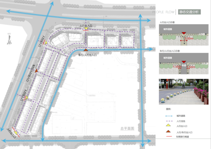 (1)出入口结合S1、S2地块的两条保留通道设置,作为车行出入口。本项目不设围墙,沿路设置多个人行出入口,纯人行入口设置景观隔离装置,禁止车辆进出,便于人车分流管理。