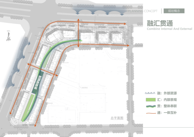 规划充分考虑基地周边与内部的绿体景观资源,将社区内外,自然人工的景观元素融为一体,并且通过后期环境设计,使绿化景观与硬质活动场地紧密结合,营造丰富而精致空间场所,以满足社区人群不同户外活动的需要。