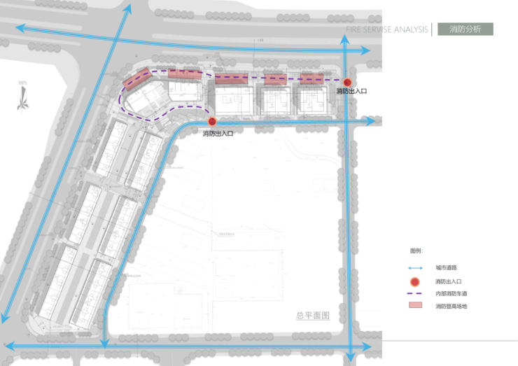(1)主要道路:南侧住宅区块,借用城市道路做环形消防车道,S2保留通道和连接道路车库入口道路宽度均大于7米,兼顾车行、人行。北侧高层商务及酒店区域内部车行道路沿大通路一侧展开,与消防通道结合考虑,消防出入口一个设置于S1保留通道南端,另一个消防应急口设置于地块东北侧。