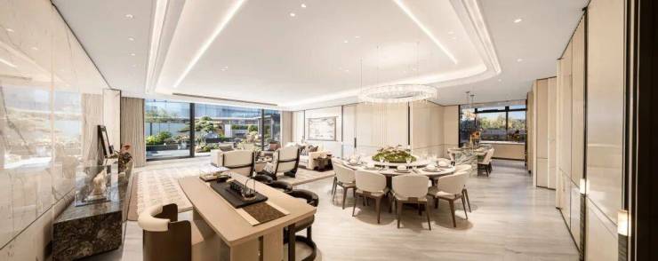 约500㎡奢阔空间,奢享从室外延伸至室内。4.2米层高,约130㎡的空间创新设计了三厅,容纳了客厅、中西餐厅与茶台多重空间,无论是朋友欢聚还是日常会客,皆可从容应对。大宽幅落地门窗,电动提升推拉门,每个空间链接环绕式露台空间,无界花园风光,真正实现“家中见园,园中见景”。六套房设计,则体现家庭平权理念,满足四代同堂所需。