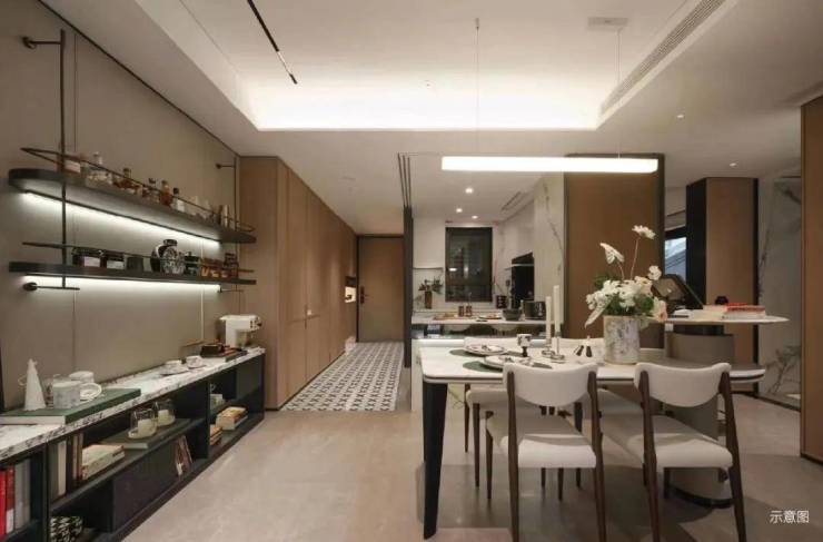其中,餐厨系统的进阶不只在于橱柜、拉篮等细节的收纳,更在于映江润府引入了创新的S墙。可以轻松将冰箱移出厨房,同时保证视觉效果的整体性。实现了为厨房预留更多空间的同时,将冰箱从食材的物理储存空间,变成了相聚待客的精神愉悦空间,一杯“快乐水”,不过是触手可及的距离,幸福感大大提升。
