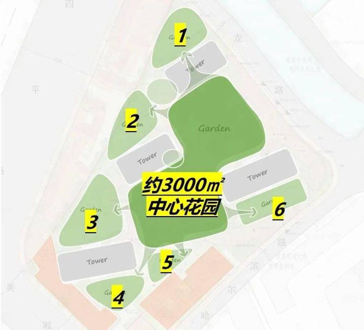景观方面 ,「外滩瑞府」通过建筑楼体的偏转,形成了围合式的景观布局。由此,项目做出了 约3000㎡尺度宏大,连续贯穿的核心中央花园 ,并利用楼栋布局与边界形成夹角,自然衍生出6个小型花园组团。