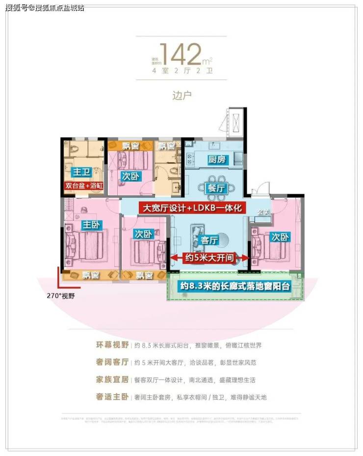 建面约142㎡户型拥有开间约8.3米的长廊式落地窗阳台,提供了宽敞的视野和开放的空间感(注意,只有一半计入产权面积)。