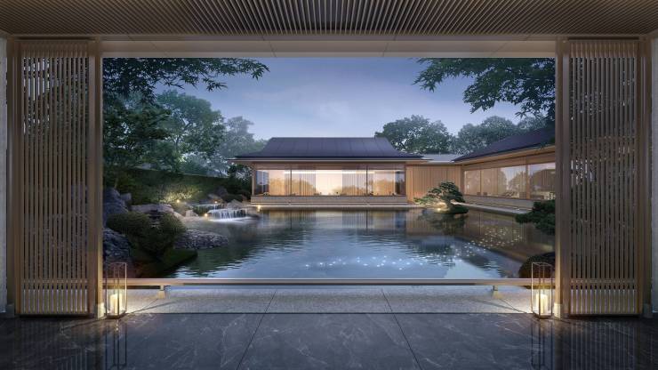 建面约219-391㎡联排别墅,新中式立面以灰白石材为骨,飞檐化入山脊轮廓。挑高阔厅,前庭后院,以“院藏山水、宅纳乾坤”致敬东方世家风范。