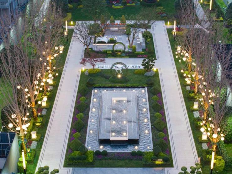 中央水景如镜,静谧深邃,当夜幕降临,水中点点灯光,如繁星坠落人间。