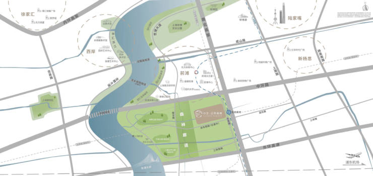 它位于上海黄浦江核心段一线:北至前滩,南至筠溪小镇,西至黄浦江,东至南北高架-济阳路。