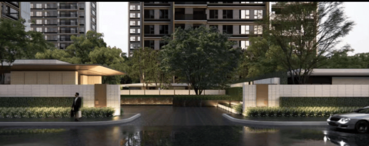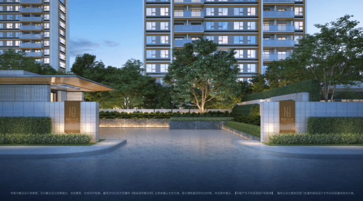 以内部围合的庭院作为社区入口的第一视角界面,对称精致的logo高墙形成夹道的礼仪大门,将繁华喧嚣的城市界面与私享的归家区域划分开来。高大的乔木与雅奢的景墙相互穿插形成内庭与外院的视线对景,完成归家的关怀与指引。