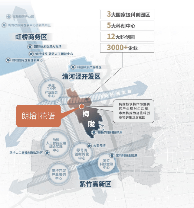 “四心”指的是四个中心,分别是1个城市副中心和3个地区中心,其中梅陇地区中心也就是「朗拾花语」所在的梅陇新中心!