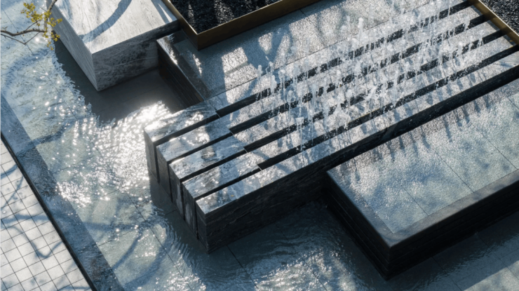 作为进入内庭的转折庭院,承载着从都市精致到松弛度假的情绪过度,掩映天光的水景将人包裹其中,向上展开的林间大树衍生向远处的水榭林间,建构起自然、静谧、雅奢的社区生活感受。