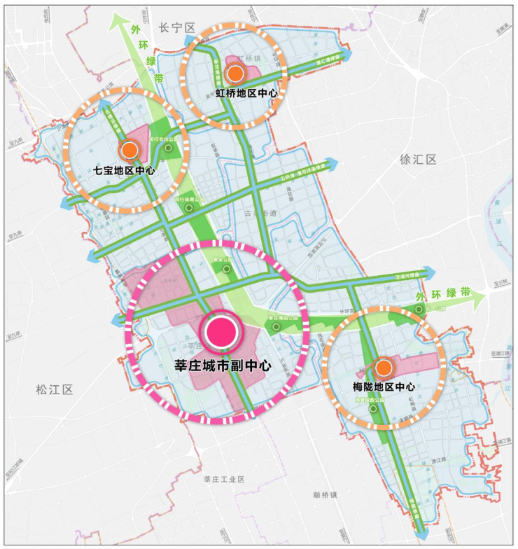 以地铁 15 号线、中运量线和虹梅高架路等为支撑,结合产业转型和滨水空间设计,与漕河泾开发区、莘庄商务区、紫竹高新技术产业园等科创基地进行产业联动,打造具有地标性的城市形象。