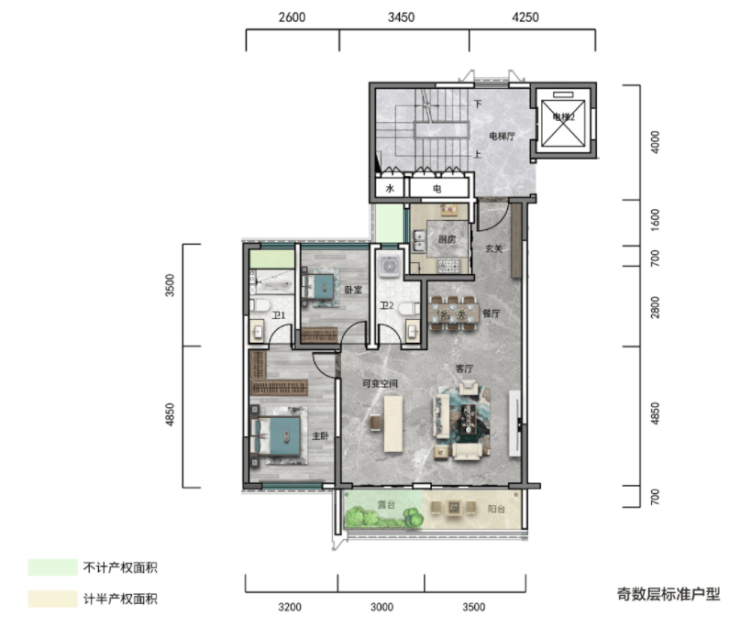 ▼建面约106㎡(2+1)两厅两卫(奇数层)