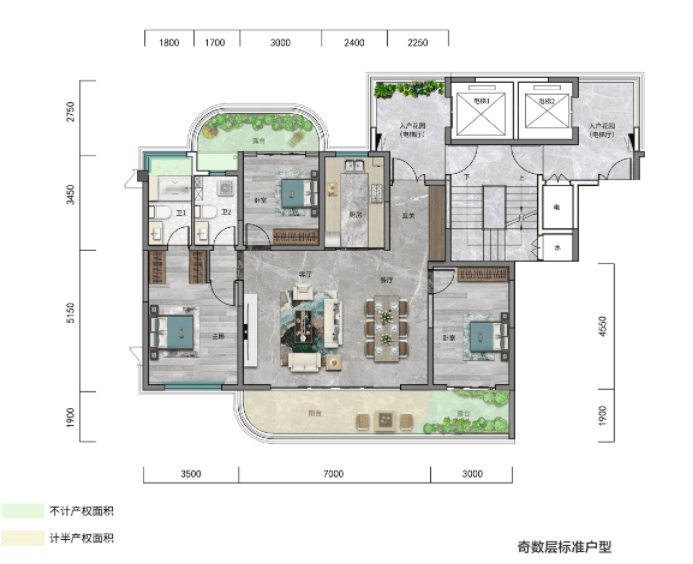 ▼建面约170㎡(3+1)室两厅两卫(奇数层)