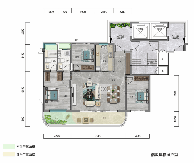 ▼建面约106㎡(2+1)两厅两卫(偶数层)