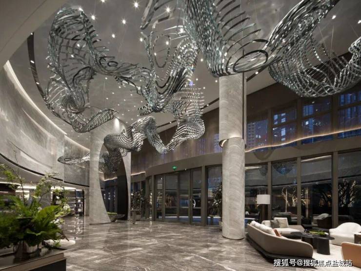 驱车从吊顶饰有灯带的明朗地库进入,电梯上来,便是面积约1300㎡、挑高约9米的超级酒店式大堂