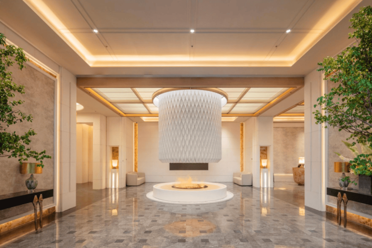 上方悬垂的 艺术吊灯并非一味追求宏大,而是更注重造型的现代感与光影的层次,光线柔和地洒下来,营造出静谧、高级的氛围。